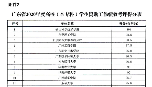 近日,广东省教育厅下发《广东省教育厅关于2020年度学生资助工作绩效考评结果的通报》(粤教助函〔2021〕6号),我校考评得分95.7分,在全省高校排名第10。