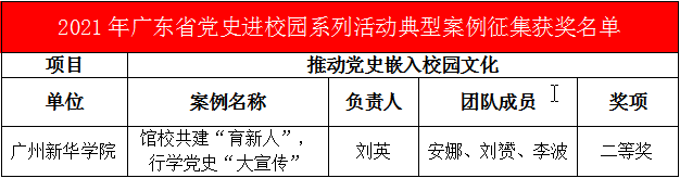 近日,由中共广东省委教育工委主办的党史进校园系列活动典型案例征集活动获奖名单公布,beat365英国官网网站《馆校共建“育新人”,行学党史“大宣传”》案例获得推动党史嵌入校园文化类二等奖。该案例由党委宣传部团队负责撰写,成员有刘英、安娜、刘赟、李波等。