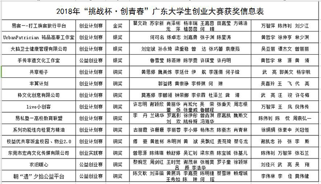 5月27日上午,由共青团广东省委员会、广东省教育厅、广东省人社厅、广东省科技厅、广东省科学技术协会、广东省学生联合会共同主办,华南理工大学承办的2018年“挑战杯•创青春”广东大学生创业大赛终审决赛在华南理工大学(五山校区)圆满落幕。我校共14件作品参赛,涵盖了创业计划竞赛、创业实践挑战赛、公益创业赛3种类型,共斩获1金3银10铜,实现了100%获奖率。这也是校团委自2014年首次组队参赛三年来获得的最高奖项,实现了我校师生在创业大赛中获奖层次与数量的双向提升。