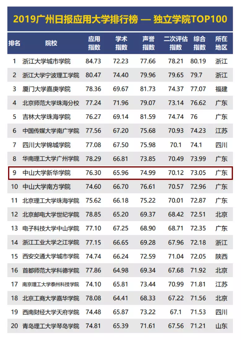 近日,广州日报数据、数字化研究院(GDI智库)联合发布“2019广州日报应用大学排行榜”。beat365英国官网网站新华学院居“2019广州日报应用大学排行榜—独立学院TOP100”全国第9位、广东省第4位。
