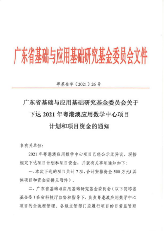 2021年12月31日,广东省基础与应用基础研究基金委员会发布2021年粤港澳应用数学中心项目计划和项目资金的通知,我校“粤港澳应用数学中心管理体制机制建设研究”项目获批立项,并获专项资金50万元,实现了我校在广东省基础与应用基础研究基金委员会项目立项方面的新突破。