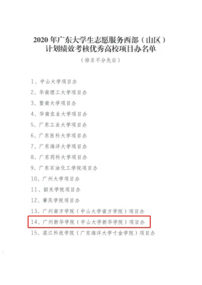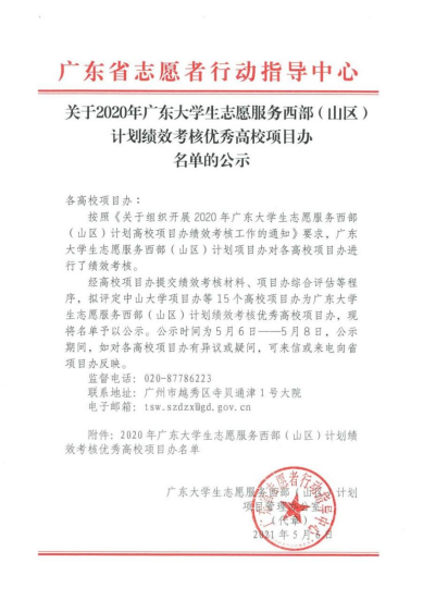 近日,广东省志愿者行动指导中心发布了《关于2020年广东大学生志愿服务西部(山区)计划绩效考核优秀高校项目办名单的公示》我校荣获2020年广东大学生志愿服务西部(山区)计划绩效考核优秀。