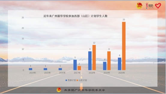 自2014年来,我校积极响应国家号召,配合开展西部(山区)计划。2020年,报名参与西部(山区)计划的志愿者数量达到了历年最高。最终,我校共有6名西部计划志愿者及23名山区计划志愿者通过考核选拔前往服务地。