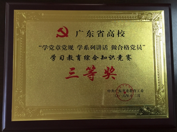 12月15日,由中共广东省委教育工作委员会主办的广东省高校“两学一做”学习教育综合知识竞赛在华南师范大学举行。我校派出领队林秋贵校长助理,教师党员史航、学生党员林裕详、黄铧英参加现场决赛,与全省18所本专科高校师生代表同台竞赛。经过激烈角逐,我校代表队荣获广东省高校“两学一做”学习教育综合知识竞赛三等奖。