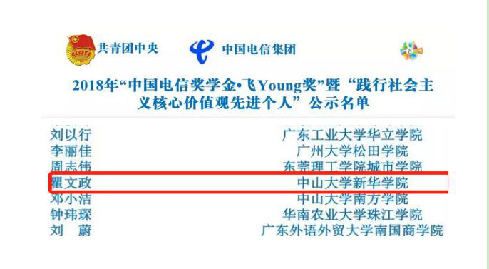 我校瞿文政同学荣获2018年“中国电信奖学金·飞Young奖”暨“践行社会主义核心价值观先进个人”荣誉称号