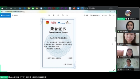 中国青年报广东站站长、中青校媒(广东)秘书长林洁老师在线向中大新华记者站代表颁奖并合影