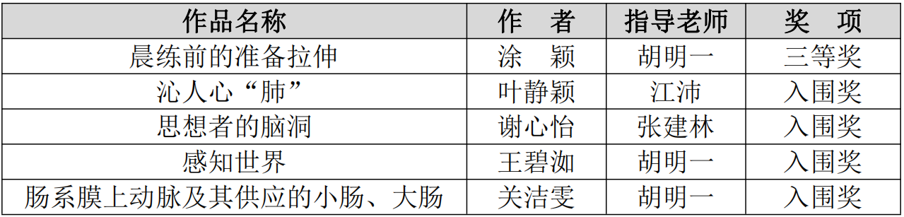 此次我校学生作品在众多院校参赛作品中脱颖而出,展现了我校人体解剖学的教学水平和医学生的专业素养。本次比赛科普了解剖学文化,激发了学生对解剖学知识的兴趣,提高了学生创新能力和审美能力,夯实了学生的医学知识基础,进一步推动了医学科普与人文艺术的融合。