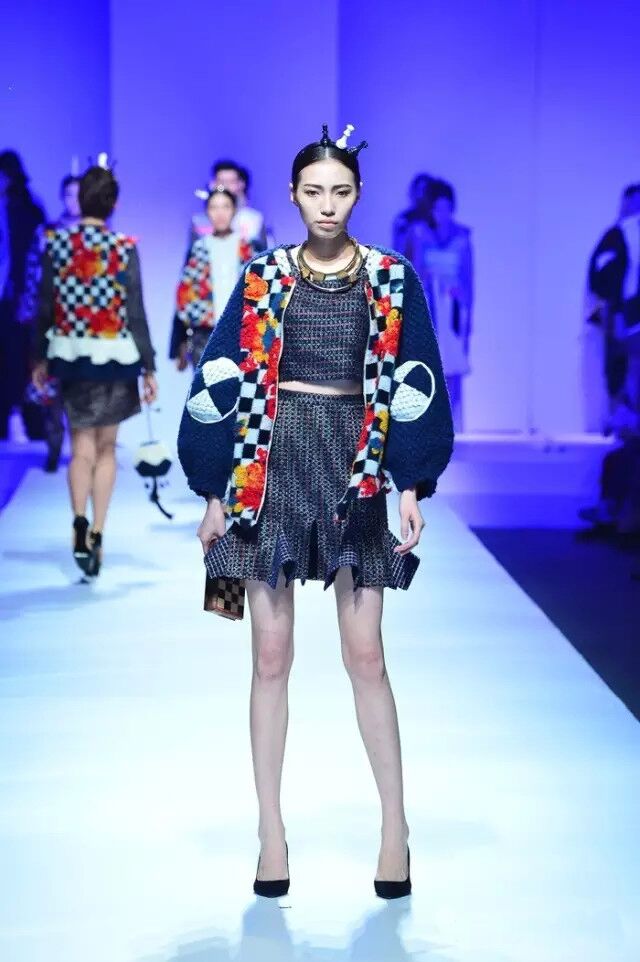 作品《棋趣》 而作品《棋趣》采用各种呢料的创意拼接,独特的格纹图案,搭配有趣的外形设计,打造出一种极具特色的舞台效果。