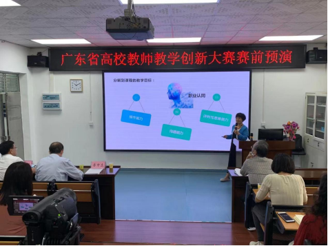 在首届全国高校教师教学创新大赛广东分赛暨广东省高校教师教学创新大赛中,王秀岚进行15分钟的课程创新汇报,逻辑清晰,创新点突出,语言表达简明而亲和。在提问环节,评委专家针对本课程中思政融入课堂的具体措施和学生成绩评价两个方面提出了问题。王秀岚和团队成员针对问题进行了详细的补充回答。