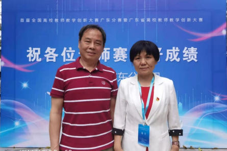 我校参赛队伍领队教务处尹小川处长(左)、护理学院执行院长王秀岚教授(右)在首届全国高校教师教学创新大赛广东分赛暨广东省高校教师教学创新大赛现场合影