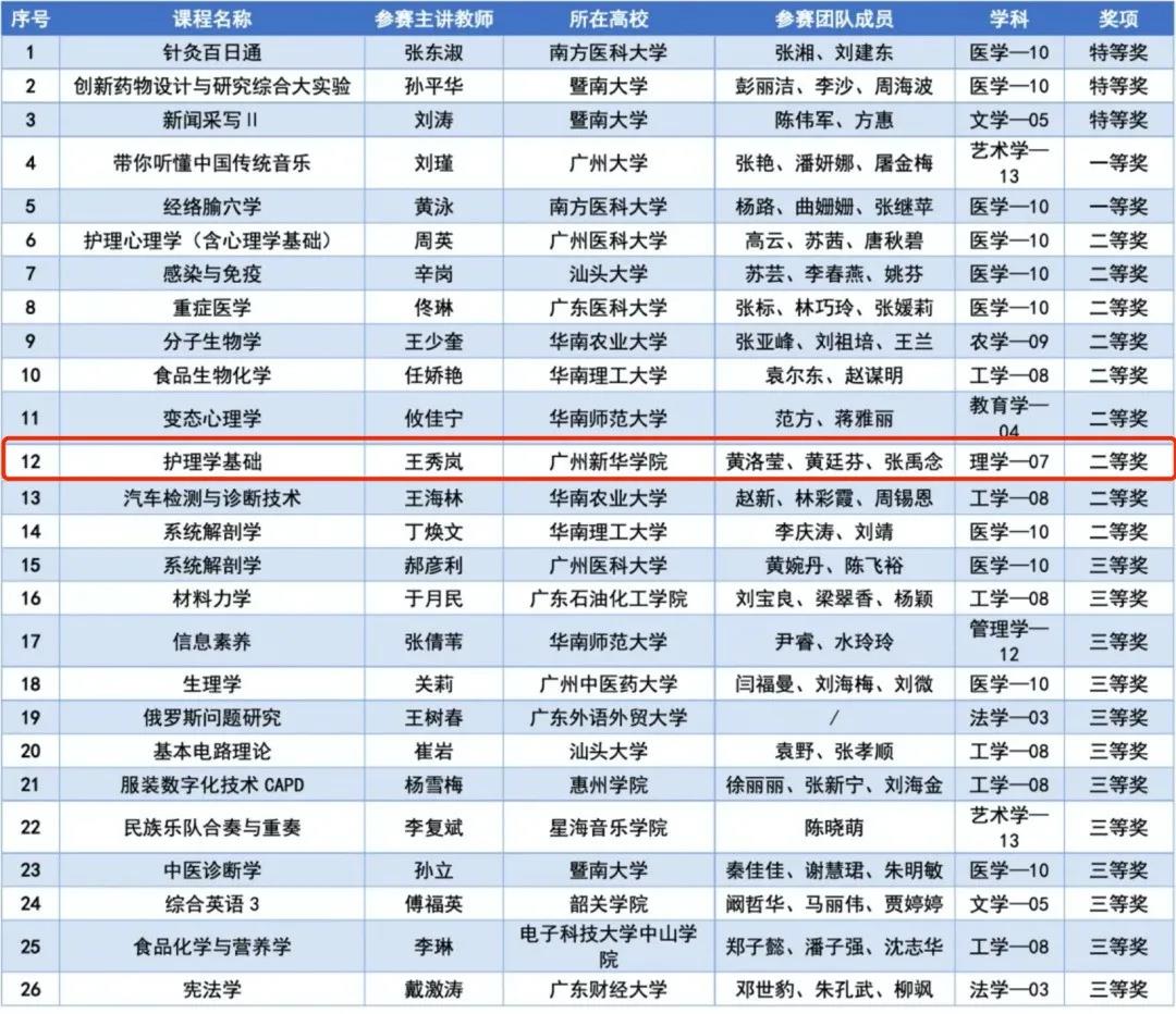 4月12日,首届全国高校教师教学创新大赛广东分赛暨广东省高校教师教学创新大赛闭幕式暨总结表彰大会在华南师范大学举办。由我校护理学院王秀岚教授带领团队成员黄洛莹、黄廷芬、张禹念,以《护理学基础》作为创新课程参赛,并获得正高组“个人(团队)二等奖”的优秀成绩。我校《护理学基础》也是广东省教育厅认定的省线上线下一流本科课程、省“课程思政”示范课程。