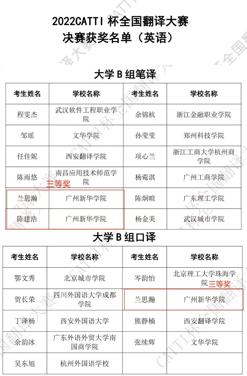 9月17日至18日,2022年CATTI杯全国翻译大赛各语种全国决赛通过线上网考形式顺利举行,并于10月30日公布成绩。我校外国语学院2019级商务英语专业的兰思瀚同学荣获口译、笔译三等奖各1项,2019级英语专业的陈建浩同学荣获笔译三等奖。
