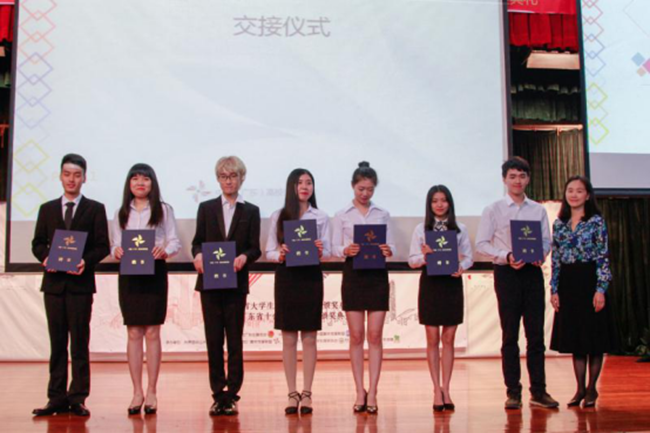 中国(广东)高校传媒联盟秘书长林洁老师(右一)为新主席团颁发聘书