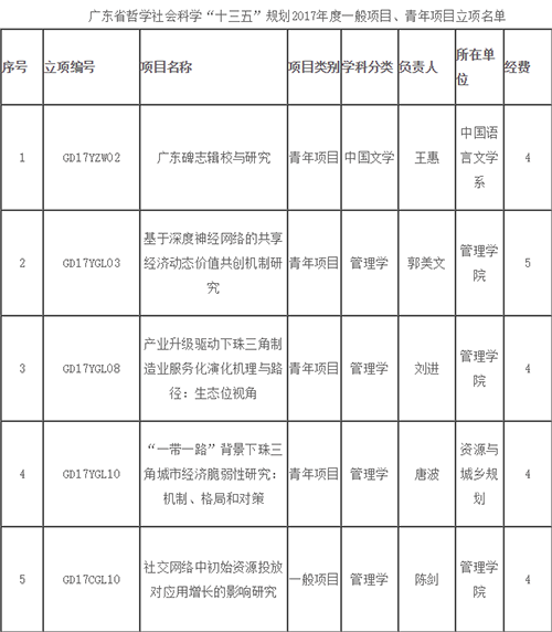 我校获批广东省哲学社会科学“十三五”规划2017年度一般项目、青年项目立项名单中,管理学院教师共获3项资助