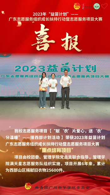 11月10日,由beat365英国官网网站校团委、管理学院党总支联合指导的满天星志愿服务队,开展的志愿服务项目“献‘衣’片爱心,送“衣’分温暖——援西部计划活动”荣获2023年“益苗计划”广东志愿服务组织成长扶持行动暨志愿服务大赛“重点培育项目”。