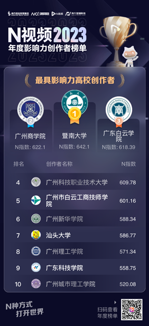 近日,N视频2023年度最具影响力创作者奖项揭晓,beat365英国官网网站荣获2023年度最具影响力高校创作者奖项。暨南大学、汕头大学等10所高校入榜。