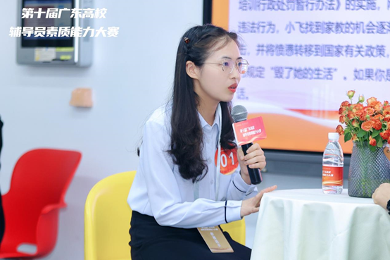 广东省决赛分为基础知识测试和实践技能比赛两个阶段。付迪以笔试前60名的成绩顺利晋级第二阶段的实践技能比赛。在接下来的案例研讨和谈心谈话两个环节中,付迪更是充分展现了自己的专业素养和实践能力,以出色表现荣获佳绩。