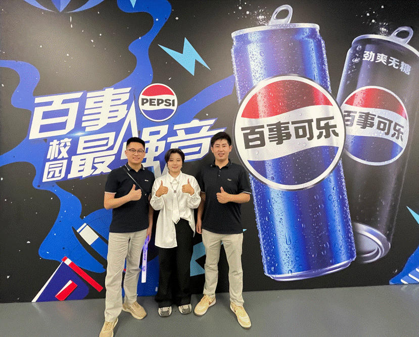2024年“百事校园最强音”全国总决赛张迈与带队老师、校团委刘佳兴老师、邹经纬老师合影