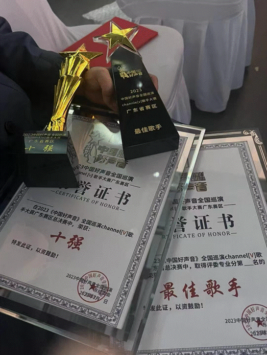 张迈在2023年“中国好声音”相关赛事中的获奖证书及奖杯