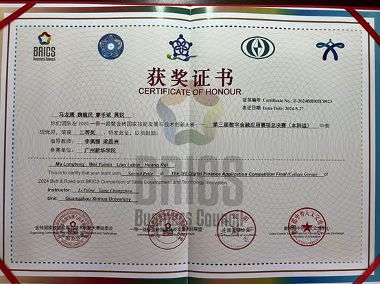 我校学子荣获2024一带一路暨金砖国家技能发展与技术创新大赛第三届数字金融应用赛项全国总决赛全国二等奖
