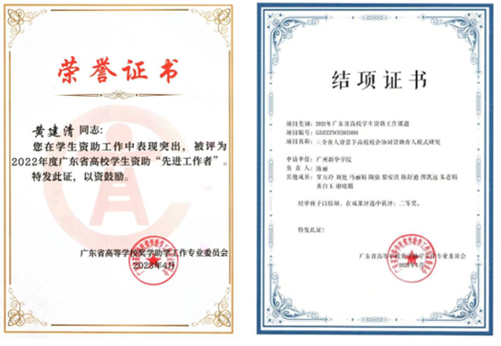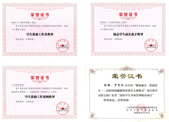 我校学生资助工作成绩突出。近五年来,我校在广东省高校学生资助工作绩效考核最高评分位列全省高校第十,被评为“优秀”;我校教师共14人次荣获“广东省高校学生资助先进工作者”,共获6项“广东省高校学生资助工作课题研究优秀成果奖”;在广东省学生资助工作典型评选中,我校2个项目获“学生资助工作案例典型”、2位老师获“学生资助工作者典型”、1名学生获“励志学生成长成才典型”。其中,《媒体融合·资助育人——高校校园融媒体资助育人新模式》项目被评为“广东省高校学生事务管理精品项目”。