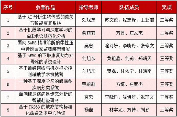 本次竞赛共吸引全省342组队伍参赛,其中81项作品入围决赛角逐一、二等奖,77项作品获三等奖。生物医学工程学院8支参赛队伍利用学到的知识对项目进行了深入的分析和优化,提出了许多创新性的解决方案,获得参赛评委的认可。