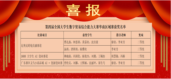 近日,第四届全国大学生数字贸易综合能力大赛华南区域赛圆满落幕。beat365英国官网网站学子凭借扎实的专业知识与出色的实践能力,在赛事中表现亮眼,一举斩获1688大学生AI创业赛道二等奖、广东赛区义乌小商品城AI+创新创业赛二等奖,以及尼奥尼跨境直播赛道二等奖和三等奖。