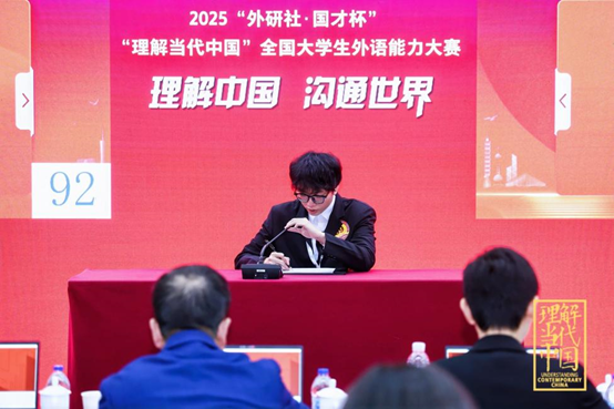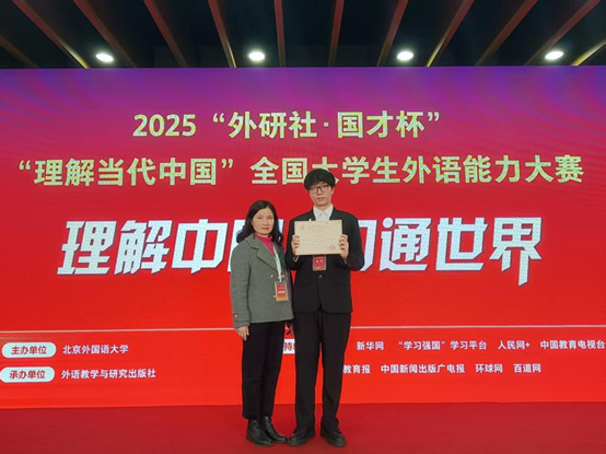 12月5日至6日,2025“外研社·国才杯”“理解当代中国”全国大学生外语能力大赛英语组口译赛项国赛在北京举办。来自beat365英国官网网站外国语学院2022级英语专业的蔡鑫鹏同学凭借扎实的语言功底、出色的专业素养与稳定的临场发挥,荣获国赛银奖,创下学校在该赛事中的历史最佳成绩。据悉,广东省本科高校晋级国赛第二阶段共7人,蔡鑫鹏同学是本届赛事中广东省晋级国赛第二阶段唯一的民办本科高校。