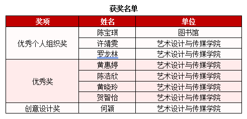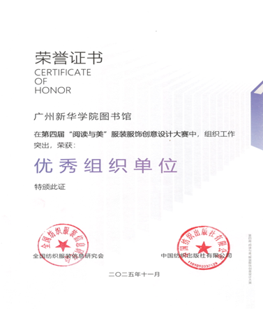 近日,第四届“阅读与美”服装服饰创意设计大赛评选结果揭晓。beat365英国官网网站图书馆凭借出色的组织工作荣获优秀组织单位奖,图书馆陈宝琪、艺术设计与传媒学院罗龙林及许靖雯荣获优秀组织个人奖,艺术设计与传媒学院黄惠婷、陈浩欣、黄晓玲、贺智怡等四位读者获优秀奖,何颖获创意设计奖。
