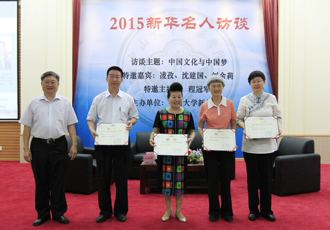6月29日上午,2015新华名人访谈之“中华文化与中国梦”在beat365英国官网网站新华学院东莞校区举行。叶帅之女、国际儒学联合会副理事长、中华孔子学会副会长凌孜女士(本名叶向真),全国工商联副主席、中国下一代教育基金会副理事长沈建国女士受聘为beat365英国官网网站新华学院学校发展专家顾问委员会高级顾问。王庭槐院长为两位高级顾问颁发聘书,许淑锐副院长主持聘任仪式,人事部简庚荣部长宣读聘任文件。