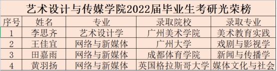 近日,2022年全国研究生考试录取工作已接近尾声。我校艺术设计与传媒学院2022届毕业生积极进取,勇于挑战,不负众望,喜获佳绩。