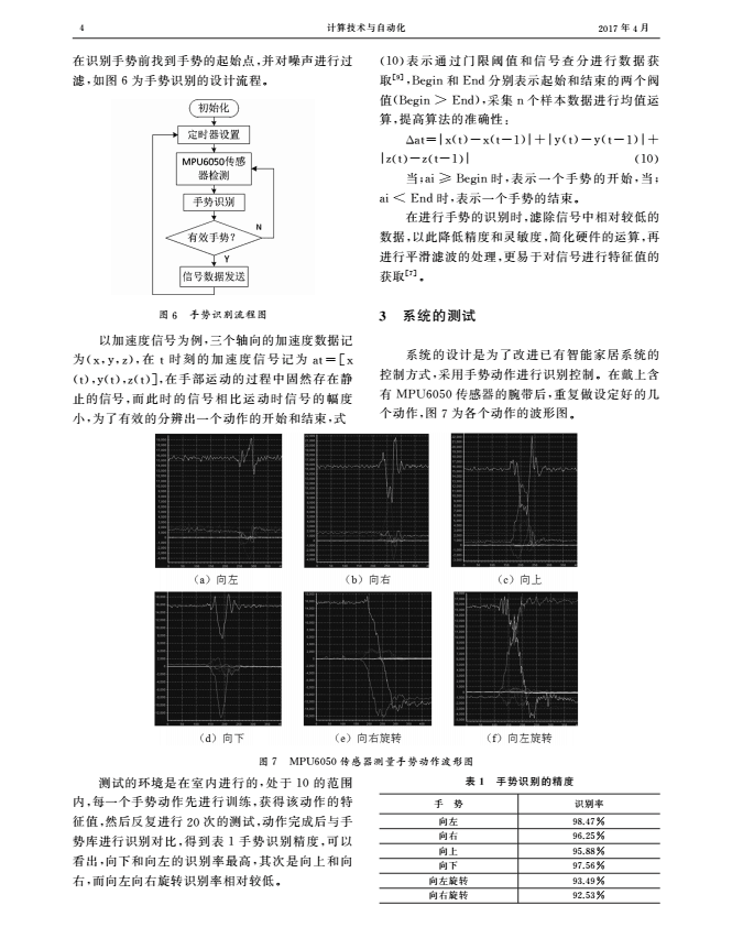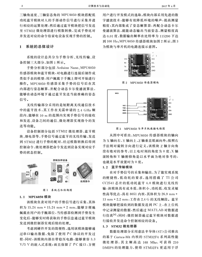 发表论文选择《一种基于手势识别的智能设备控制系统的设计》这个题目,是因为最开始是把手势识别作为大学生创新创业训练计划项目并获得国家级资助,有一定的研究基础,在原项目的基础上对系统进行了技术改进,主要研究手势识别数据解析、手部动作的分析以及滤波。采用整合了三轴加速度、三轴角速度、三轴姿态角的MPU6050模块搭配低功耗蓝牙模块对人的手部动作信号进行采集并进行相应的运算处理,然后通过蓝牙模块把信号发送至STM32微处理器进行模数转换,完成手势比对并发送对应的命令给家电设备实现手势的控制。在进行手势的识别时,滤除信号中相对较低的数据,以此降低精度和灵敏度,简化硬件的运算,再进行平滑滤波的处理,更易于对信号进行特征值的获取。