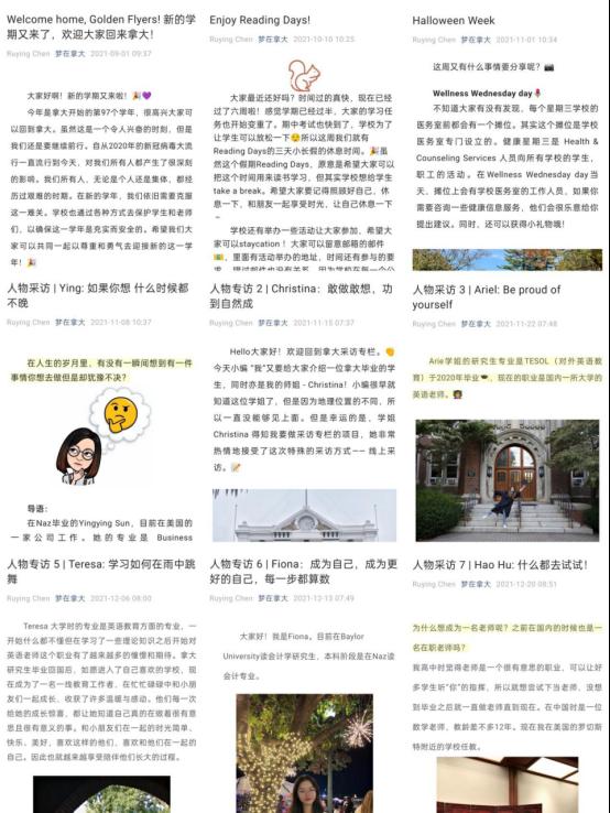 陈汝颖在拿撒勒大学还有一个特别的身份,她担任着拿大微信公众号“梦在拿大”的小编,每周都会为关注拿大的学子们推送一篇精美的推文。透过她的文字,你会感受到她细腻的文笔和积极向上的态度。她传递的不仅仅是梦在拿大的故事,更是她本身对生活的热爱和追随。希望有更多的新华学子能够踏上与陈汝颖相同的学习之路,将青春的奋斗之花,绽放在美好的地方。