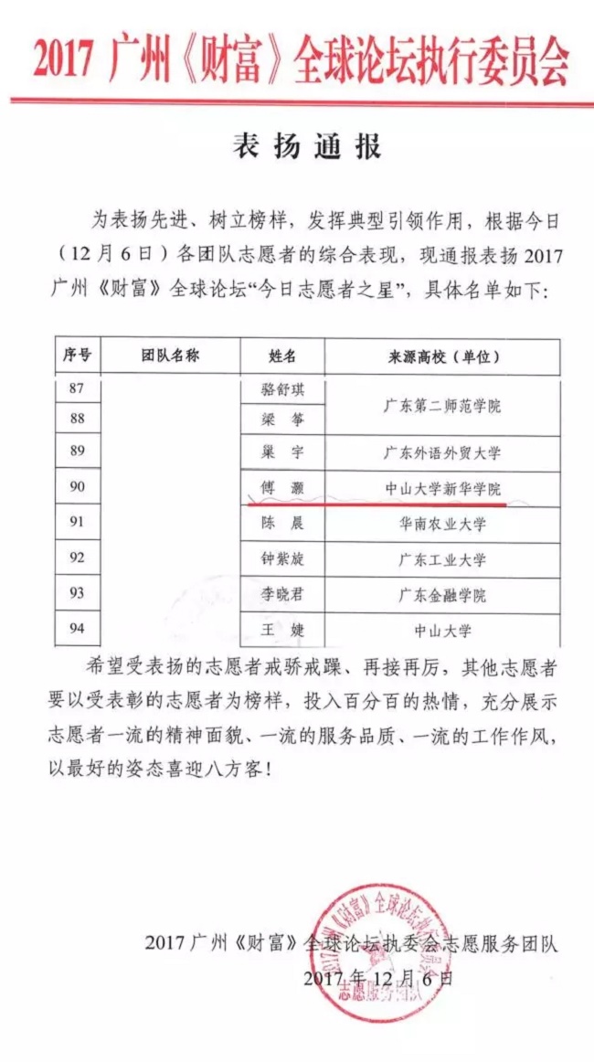 当获悉自己被评为2017广州《财富》全球论坛“今日志愿者之星”时,傅灏同学表示,非常感谢志愿服务团队对自己工作的肯定,团队中的每一位志愿者都非常的优秀,这不仅一份荣誉,更是一份责任。