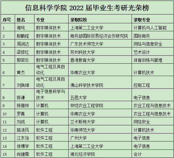随着2022年考研招录工作接近尾声,beat365英国官网网站2022届毕业生考研捷报频传。我校信息科学学院2022届毕业生共有15名学子考研升学成功,再创佳绩。国内升学13人,包括华南师范大学、华南农业大学、广州大学等重点高校,境外2人,分别为香港教育大学、兰卡斯特大学。