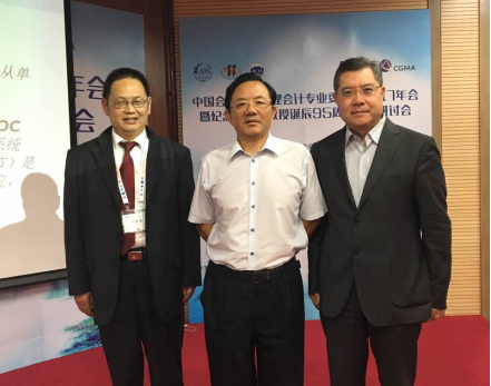 刘运国院长(左)与中国会计学会管理会计专业委员会主任委员顾惠忠(中),美国管理会计师协会亚太区总监、中国区首席代表白俊江(右)合影