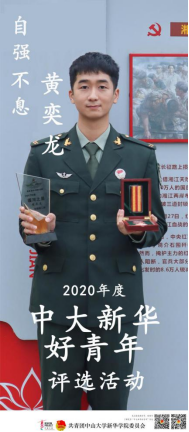 他不断挑战自己,努力向优秀看齐,把爱国情、强国志化为报国行。他不向困难屈服,只为绽放青春梦想、实现自我价值。他就是2020年中大新华自强不息好青年——黄奕龙。