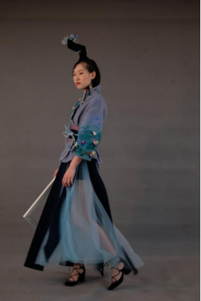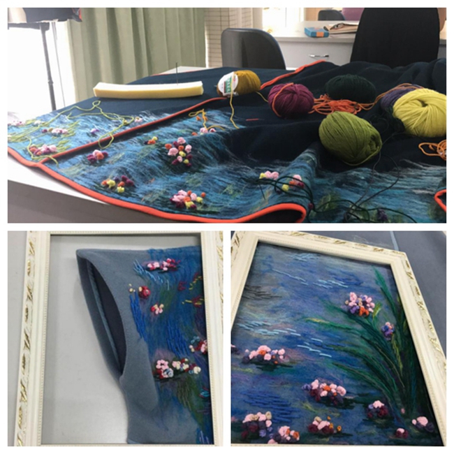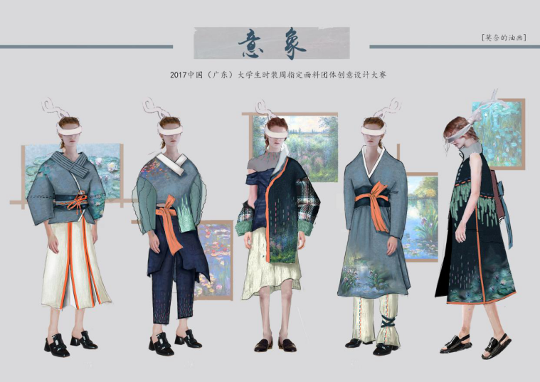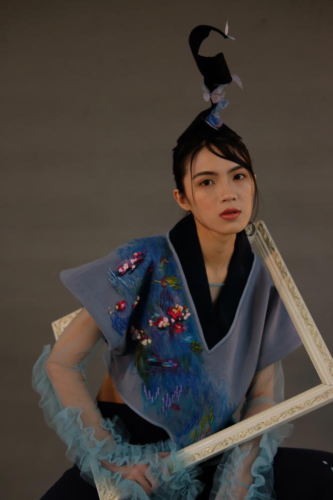 据了解,「意象」的灵感来源于莫奈的油画,同学们在每套服装上都运用莫奈不同的画作,其中包括睡莲系列、塞纳河畔等,采用中国汉服的结构轮廓造形,结合毛毡和刺绣的工艺进行面料改造来表现立体感的莫奈油画肌理,通过这种中西文化的融合展现出作品《意象》。