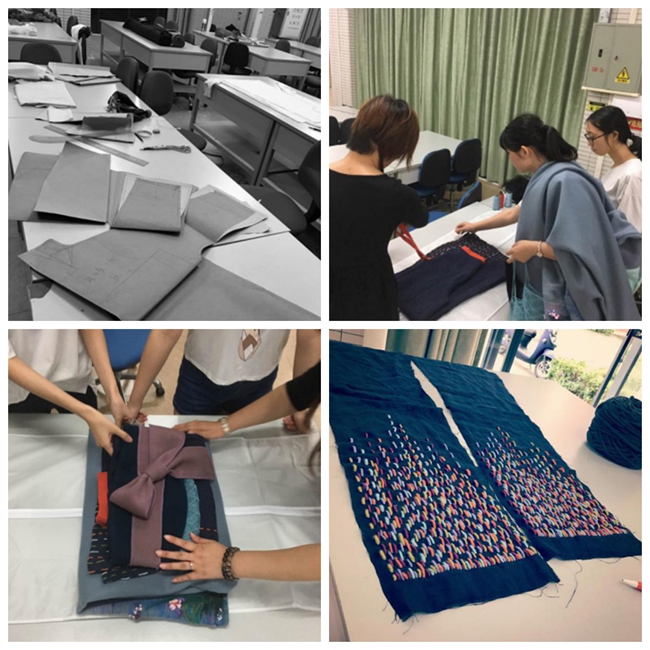 在创作过程中,按照计划首先完成内部搭配服装,但完成一半时,同学们发现由于商家提供的面料与之前挑选的面料发生质感和色彩上的改变,造成效果出入特别大。然而时间已经非常紧迫,大家的争议十分激烈,为保证作品质量,最后决定抛开所有不合适的面料组合,重新按照现有的新面料进行搭配设计。