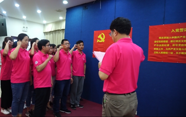 会议最后,全体成员重温入党誓词。双方代表面对党旗,我校管理学院党支部同志神情庄重,举起右拳,在管理学院党总支书记彭建平同志的领誓下庄严宣誓。