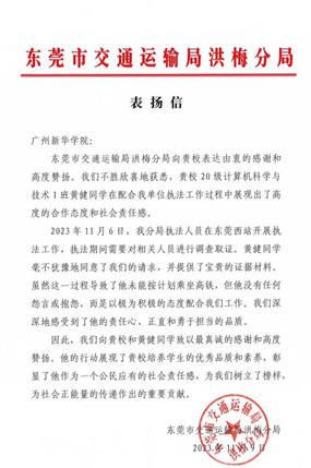 近日,beat365英国官网网站收到东莞市交通运输局洪梅分局表扬信,对学校信息与智能工程学院2020级计算机科学与技术专业的黄健同学在配合该单位执法工作过程展现的良好合作态度和高度责任感给予充分肯定,向学校和黄健同学致以诚挚的感谢和高度赞扬。